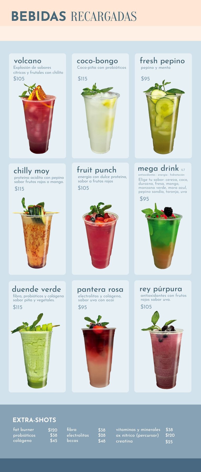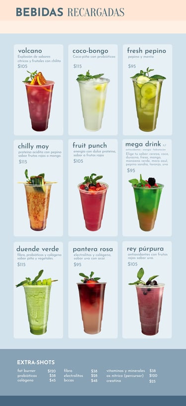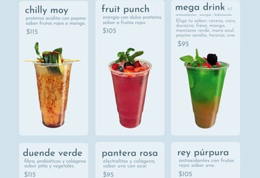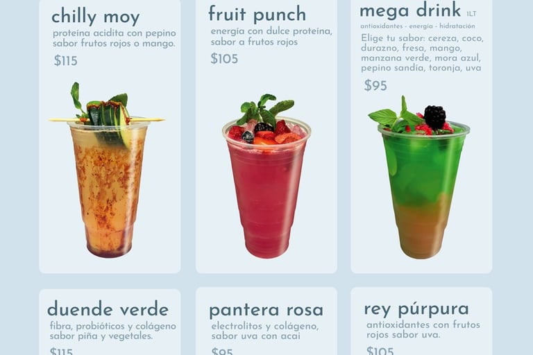 Pueden contener: electrolitos, colágeno, proteína, fibra, probióticos, sábila, vitaminas y minerales.